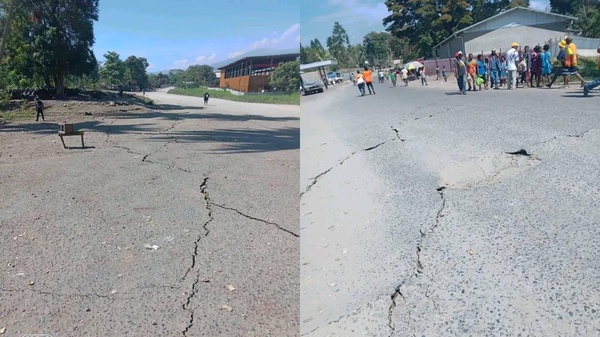 巴布亞紐幾內亞昨(11)日發生規模7.6的強震,美國海嘯預警系統一度發布海嘯警報,當地馬路裂出足以吞人的大縫、多棟建築物受損,目前已造成至少5人死亡、多人受傷。從網路上流傳的畫面顯示,強震來襲時,當地居民驚慌失措,不斷吼叫狂奔,甚至差點遭巨縫吞噬,場面相當驚悚。
