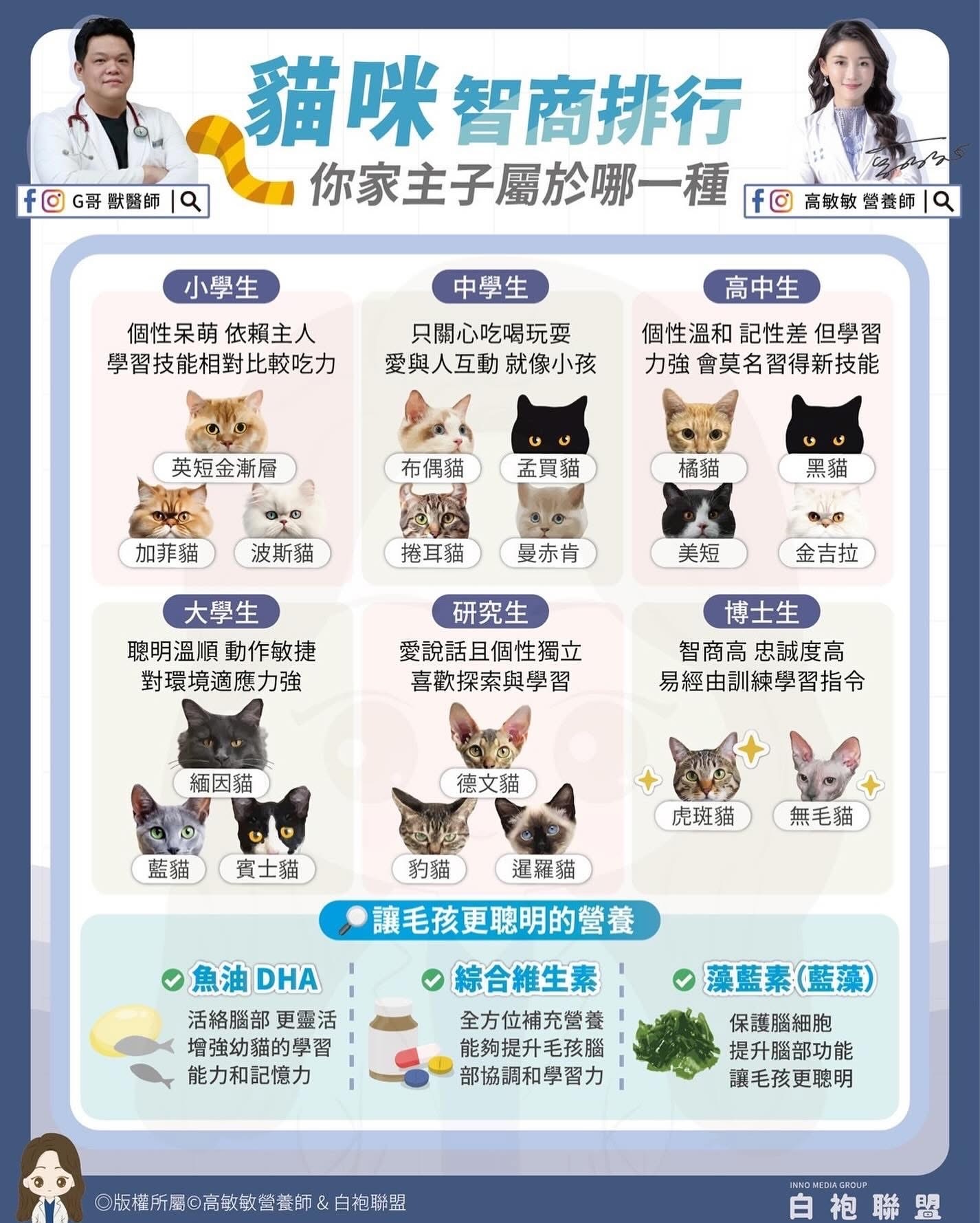 這些貓咪學習能力一流,個性獨立,喜歡探索與學習。尤其是暹羅貓,牠們愛喵喵講不停,似乎總有說不完的話題。