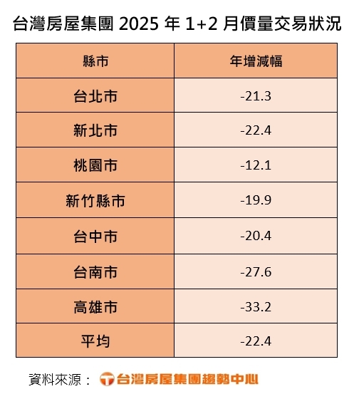 台灣房市在2025年初面臨嚴峻挑戰,受到限貸令的影響,交易量大幅下滑。根據台灣房屋集團的統計,2025年一、二月的房市交易量相比去年同期減少了22.4%。其中,高雄的交易量降幅最大,達到33.2%,其次是台南,下降了27.6%。這一現象顯示出限貸令對房市的影響深遠。
