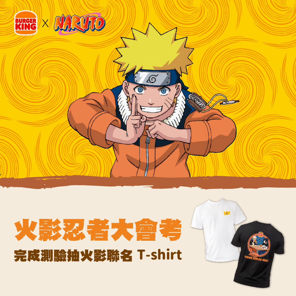 ▲ 805將開始第二波火影忍者大會考,填答就可領火影地瓜薯優惠券,還有機會抽聯名T恤。(圖/漢堡王)