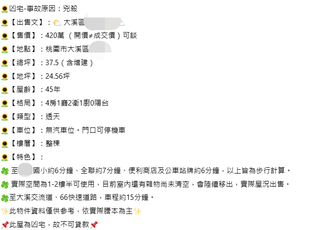 桃園大溪一間45年屋齡的透天厝因於2023年12月發生「妒夫殺妻案」而成為凶宅,57歲的曾姓男子因懷疑胡姓妻子外遇,持水果刀刺中心臟,導致其當場死亡。事後,曾男要求孫女報警,並於今年5月被判處7年10個月有期徒刑。近日,有房仲業者以420萬出售這起發生過凶殺案的住宅,不僅明確說明事故原因,還特別註明「此屋為凶宅,故不可貸款」,引發網友熱烈討論,有人直呼屋況「慘烈」,甚至形容:「連價格都比凶殺還凶」。