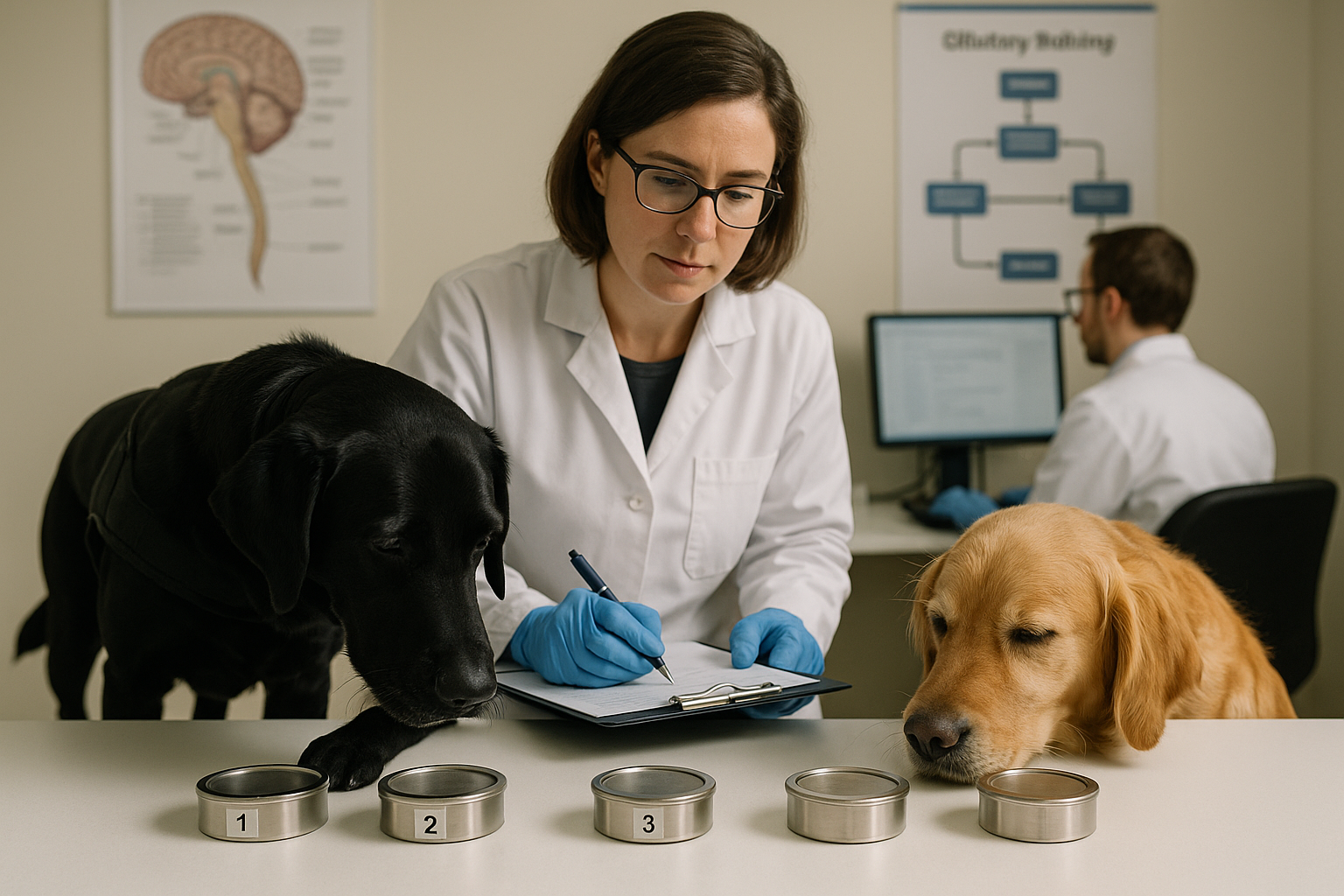 這項研究由英國慈善機構 Medical Detection Dogs 聯合布里斯托大學、曼徹斯特大學等單位共同進行。團隊共招募了超過 200 名受試者,包括確診 PD 患者與健康對照組,並於雙盲條件下收集皮膚分泌物樣本。樣本來源是受試者背部與額頭皮膚輕拭,收集含皮脂的拭子。參與研究的犬隻包括一隻金毛獵犬與一隻黑色拉布拉多,經過長達 38 至 53 週的獎勵導向嗅覺訓練,犬隻學會在多個樣本中鎖定 PD 氣味。