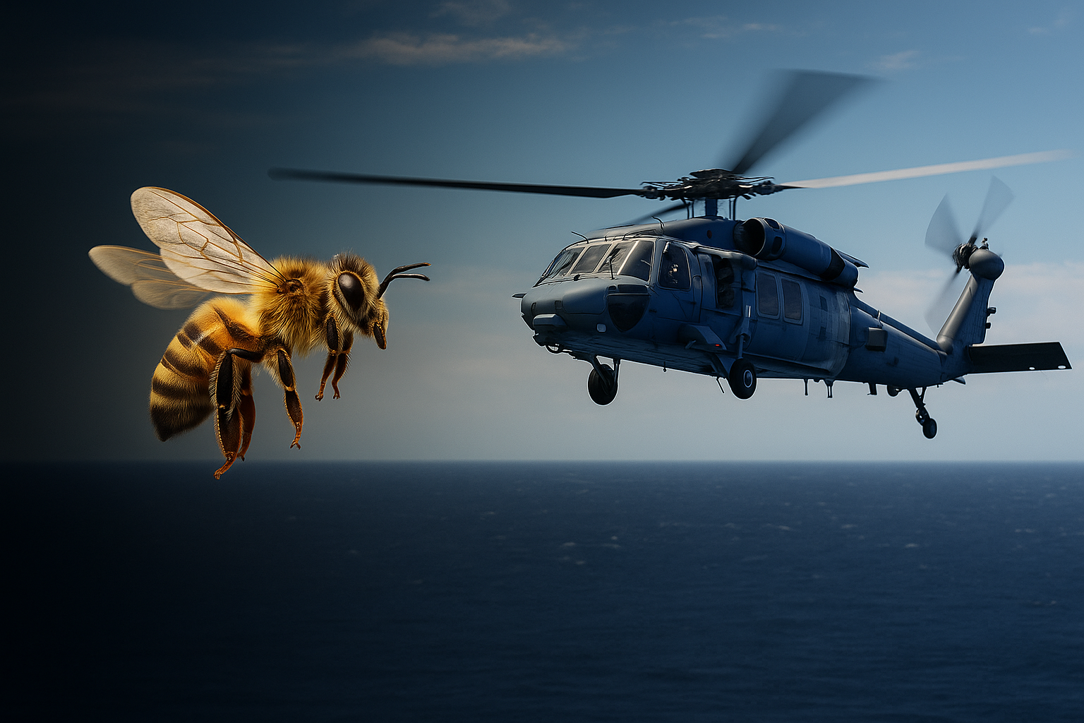 相比之下,直升機的主旋翼轉速通常為每分鐘270至330轉,折合為每秒約4.5至5.5轉。蜜蜂翅膀每秒230次的拍動速度,的確是其超過45至50倍以上,部分條件下甚至接近67倍。雖然這項比較不完全等值,但足以彰顯蜜蜂飛行系統的高頻控制與懸停能力。