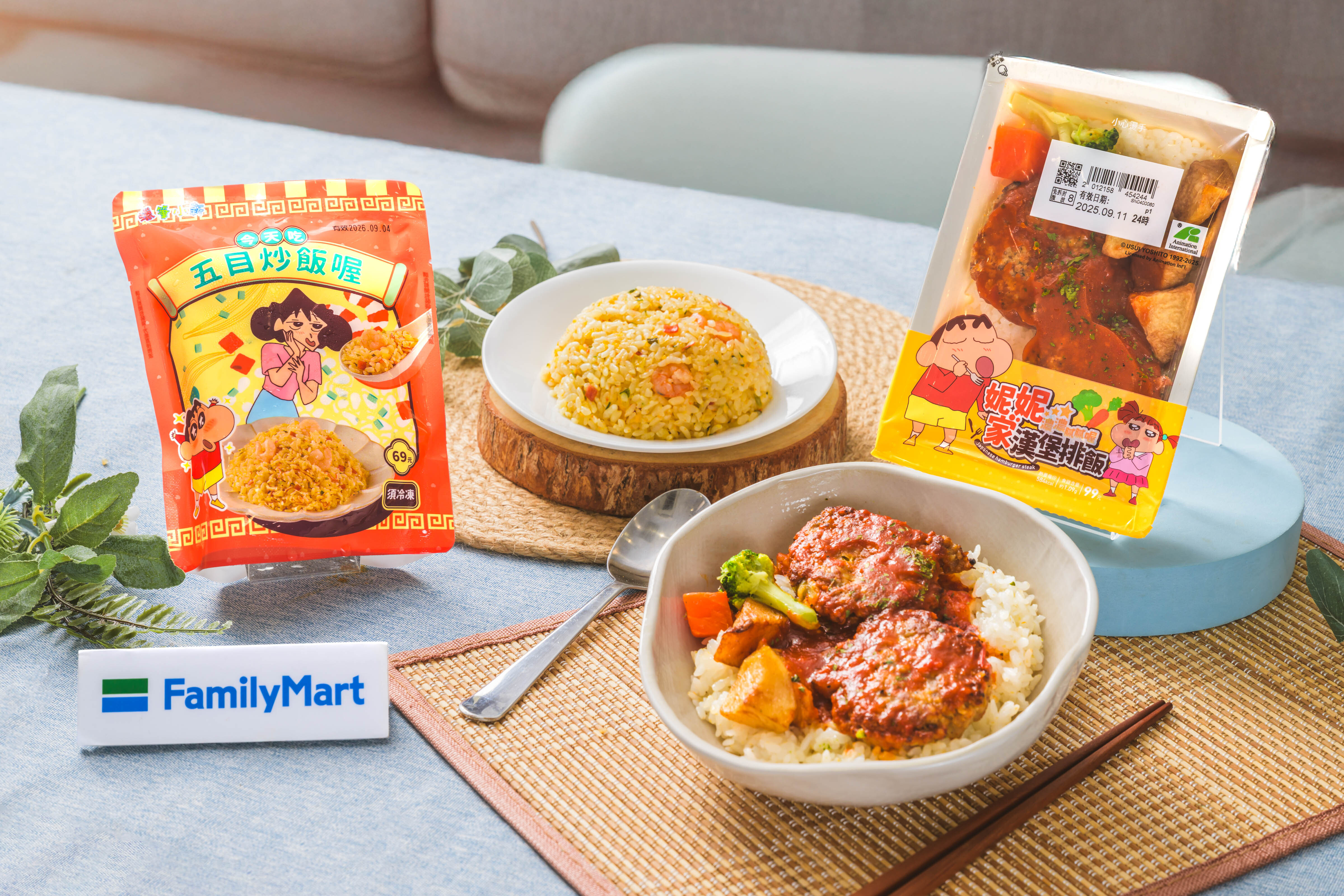 ▲ 小新粉必吃!動畫美味真實重現,妮妮家漢堡排、五目炒飯一口吃回童年。(圖/全家)
