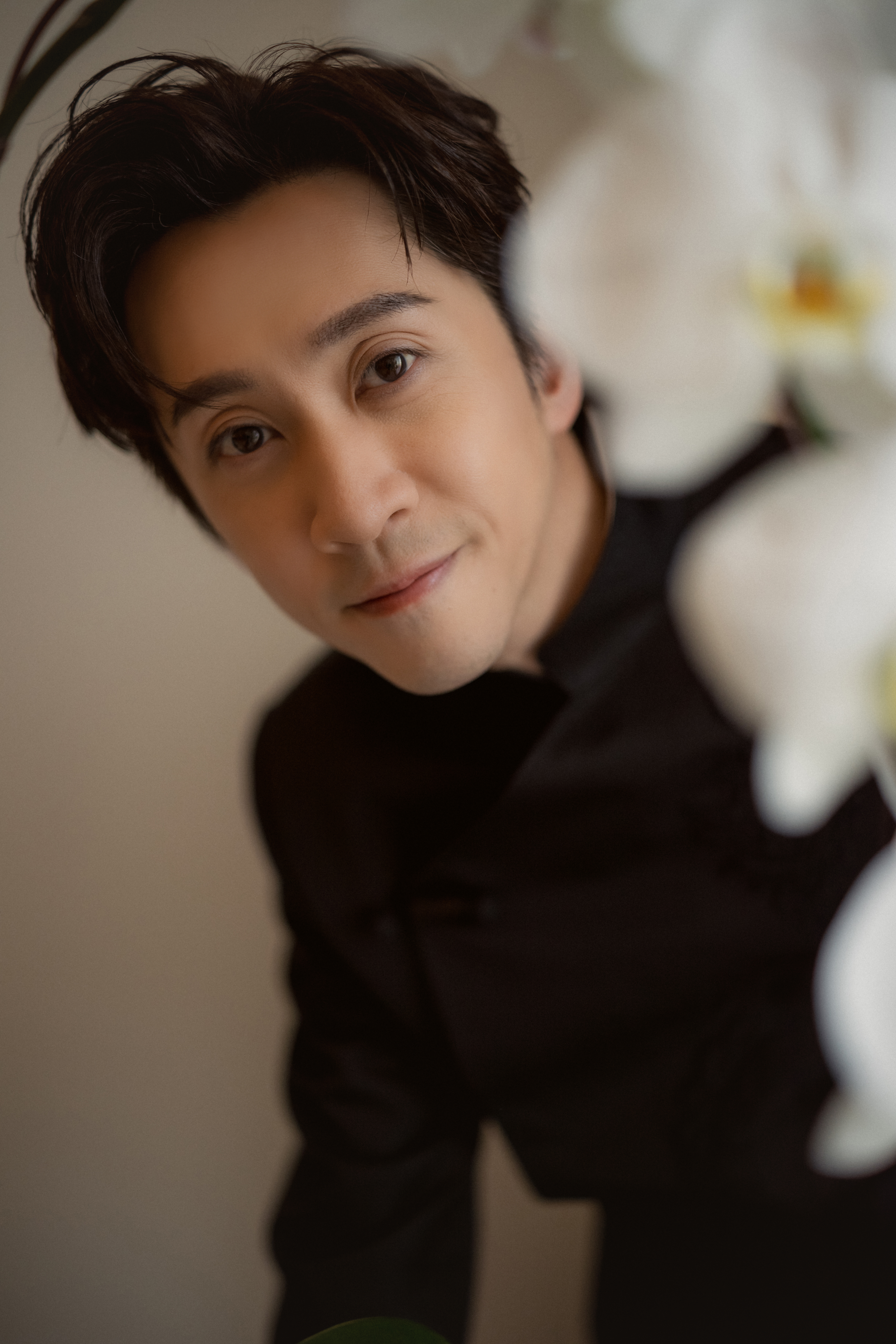 新郎陳漢典則身著全黑中式訂製禮服,以西裝為剪裁基礎,不著痕跡地融入中式立領與斜襟設計,形塑出別具人文氣質的當代中式正裝風格。俐落的結構線條強化肩線與身形比例,使整體輪廓更顯挺拔修長,低調而不失文化深度。胸前大面積刺繡以「龍」為意象,也象徵著新郎的氣度與守護,細節之中展現沉穩內斂的力量。