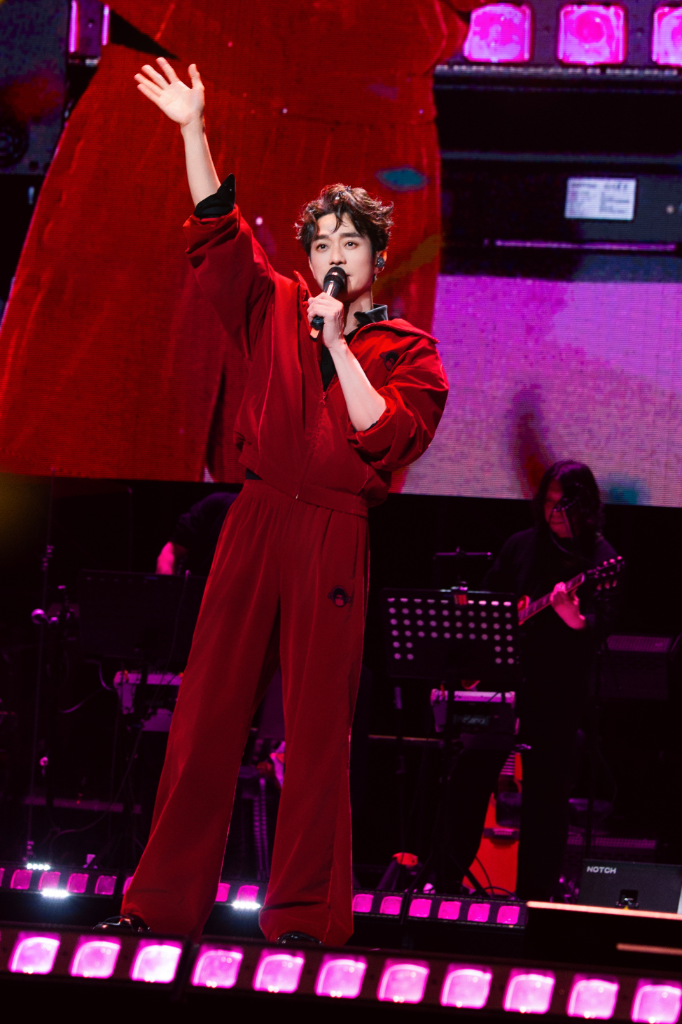 ▲ 張棟樑首次個人巡迴《第21個故事》澳門收官場開唱一身喜氣紅趣稱自己是「紅包」。(圖:張棟樑「第二十一個故事」巡演官方)