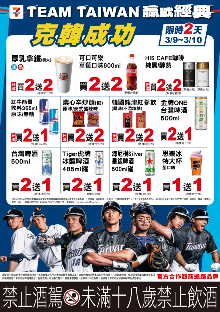 統一超商為慶祝中華隊克韓成功,推出限時兩天的加碼優惠。3月9日至3月10日期間,CITY CAFE厚乳拿鐵(特大)、HIS CAFE咖啡純黑或醇熟、可口可樂草莓口味600ml等商品買2送2。此外,農心辛炒麵、韓國熊津紅蔘飲也享有買2送2的優惠。思樂冰特大杯買1送1,紅牛能量飲料355ml則是買2送1,讓球迷在觀賽時能夠補充能量。