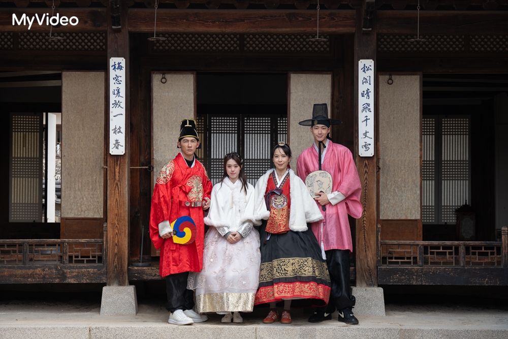 ▲ 《花甲少年趣旅行》全員穿韓服,天心(右2)再度體驗傳統文化直讚:韓式浪漫氛圍都出來了。(圖:台灣大哥大MyVideo)