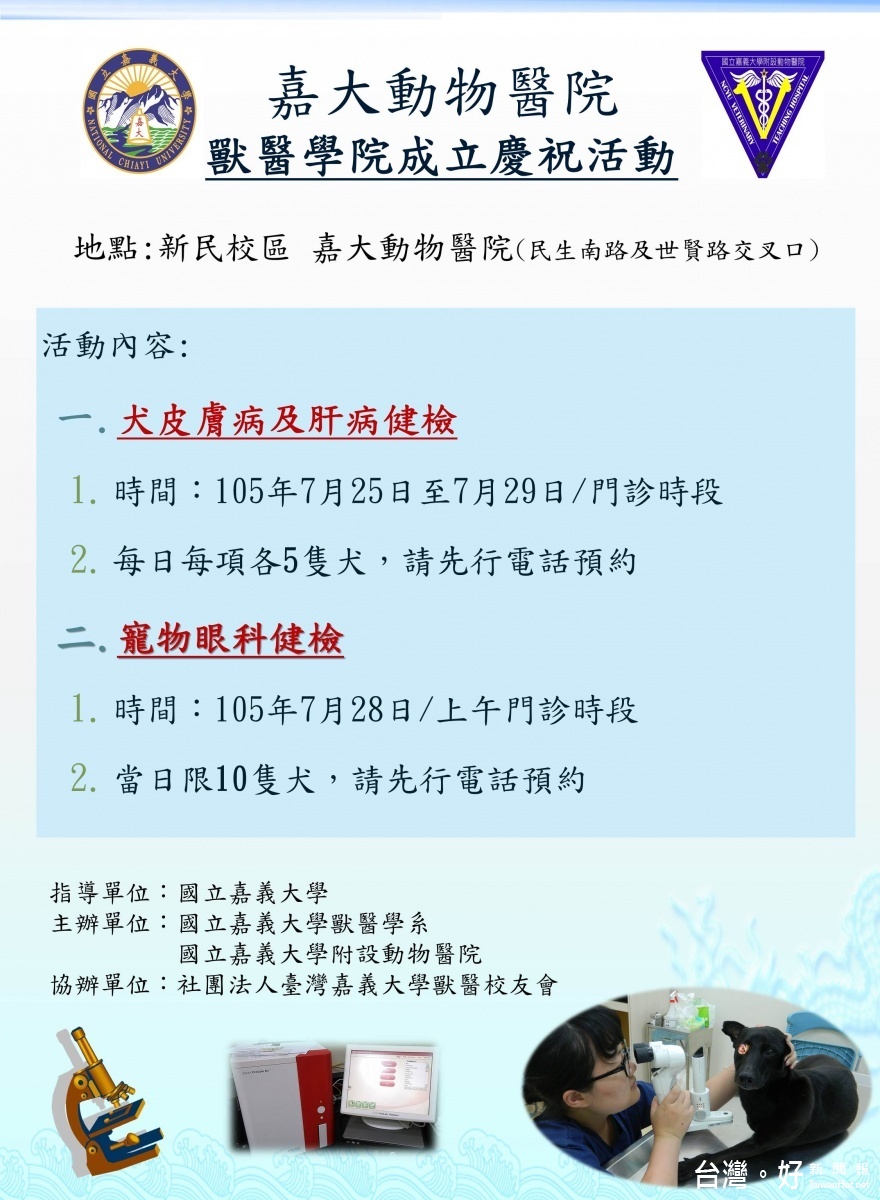 嘉義大學附設動物醫院為慶祝獸醫學院成立,於7月25日至29日門診時段舉辦免費犬肝病、犬皮膚病健檢活動,每日此兩項健檢活動各只接受5隻名額免費;7月28日獸醫學院揭牌典禮當天,上午門診時段亦接受10隻犬貓免費眼科健檢活動,請飼主於活動日前,以電話或到院先行預約。