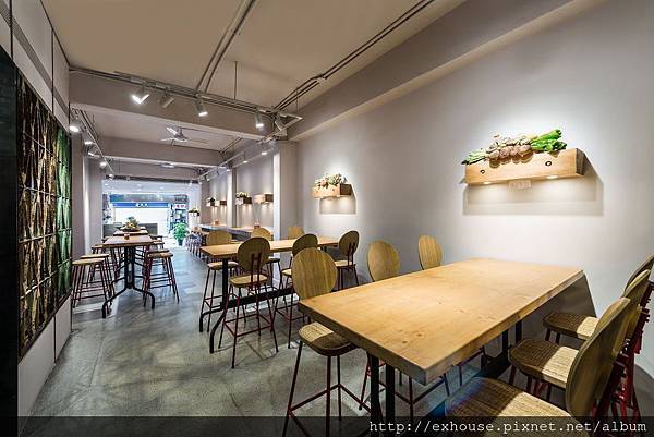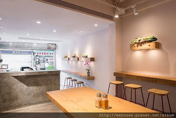 店內牆壁大片面積留白,搭配軌道燈,說明業主的另一種想像:夜市裡的藝廊。因為於師大附近,希望未來能進一步和其藝術相關科系學生合作,讓食堂也能成為藝術作品的展示販售空間!