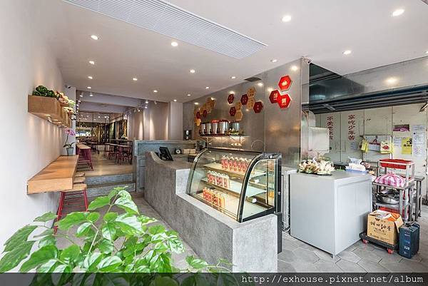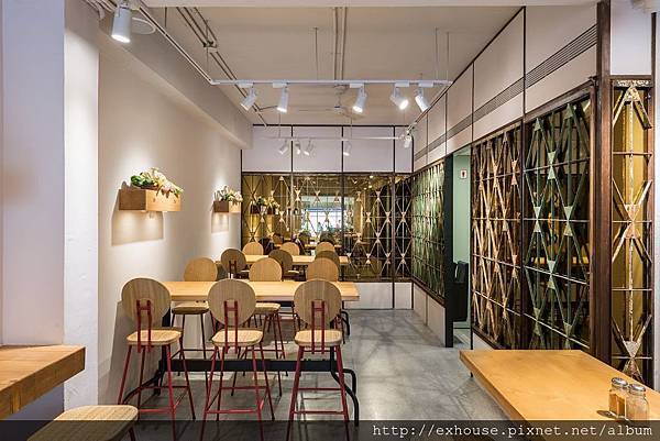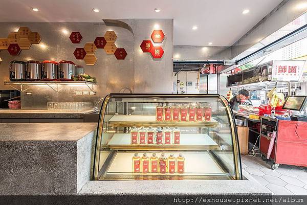 考量週邊環境的夜市文化,利培安到處掏寶,找來骨董等級的老鐵花窗作為壁面裝飾,以求空間和該地的特殊文化元素產生連結。他解釋,夜市攤販樓上的住宅總為居住安全緣故,特別加裝鐵窗,形成特殊的都市景觀,把這在地的元素放置在空間中,再貼切不過!在材質的選用上,大量使用台味濃厚的磨石子作為吧台和地面的材質,更為呼應師園LOGO 標準色在地坪上嵌入紅色琉璃,從細節玩美妝點空間。不論是新客人或老主顧都能在裡頭,一一細數窩藏各處的新創意和老靈魂!