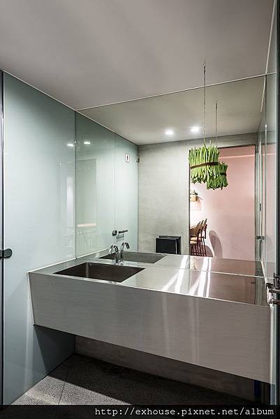 廁所以不鏽鋼夾作為門把,水槽比照廚房專用的耐高溫、耐磨損不銹鏽材質,量身訂製的豆芽燈,創意呼應鹹酥雞攤最熱銷的蔬菜品項!
