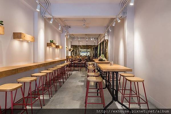 率先微改造餐車後,重頭戲就落在這三十坪的室內用餐區了!過往來客皆已習慣外帶餐點,新開設的室內用餐區賣點在:提供一個可悠閒坐著享用鹹酥雞的全新消費體驗。想要稍事休息的食客們,只要點餐達最低消費金額,即可入內挑選自己喜歡的位子,坐下來大啖鹹酥雞。木桌搭配紅色椅腳的訂製椅,放在白色為主的空間,明亮又溫潤,瞬間從混搭的街道中跳脫出來,讓人忍不住多看幾眼。