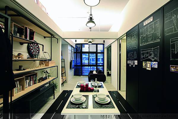 住家格局以十字形軌道作軸線,利用倉庫風拉門、以及黑板作活動牆面,搭配偽裝成收納櫃的掀床,依照需求可靈活隔出餐廳、客廳、客房、主臥