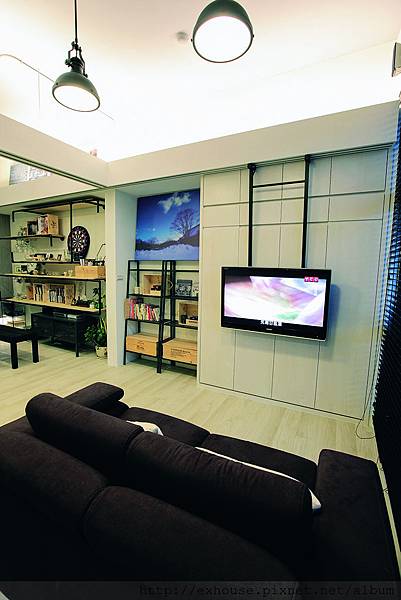 其中最特別的是能橫移近七米的活動電視,令屋主在每個角落幾乎都能看的到,我們採用14米長工業用履帶包覆HDMI線與電源線,維修孔就在上方間接照明處;