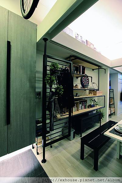 一旁的鞋櫃則是使用系統櫃裝設1字型鐵製把手,質感倍增。$ 鐵件玄關活動屏風、衣帽架,NT.12,000元/組,日和室內裝修設計:02-2598-6991。