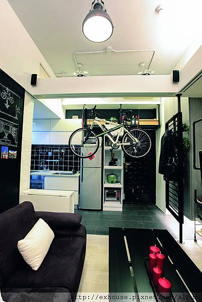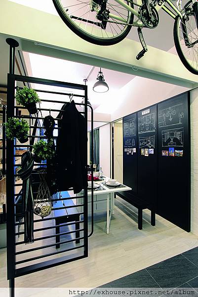 而一入門的玄關處是屋主不會長時間停留的區塊,便利用升降曬衣桿加上S型掛勾改裝成手動式腳踏車收納處。