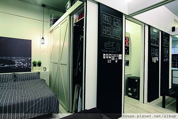 三片活動黑板就是區隔主臥與公共廳區的活動牆,平常可充當屋主的記事板,現在上頭就是設計師繪製的「住家機能使用說明」。