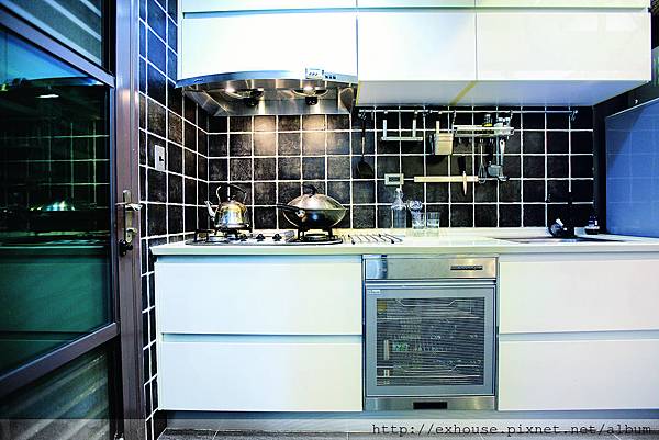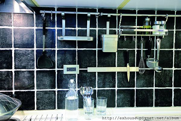 因為預算因素廚具沿用建築公司提供的,但磁磚改採西班牙進口的黑色復古磚,除了斑駁的顏色、特別的破損設計磚緣只要簡單搭配白色抹縫就很有味道,