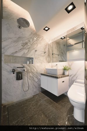 與一般小住宅的陽春衛浴間不同,大片石材鋪成的牆、地面,與細緻工法的內嵌置物檯體現了尊貴感,讓屋主的生活品味再提升。