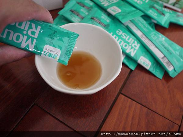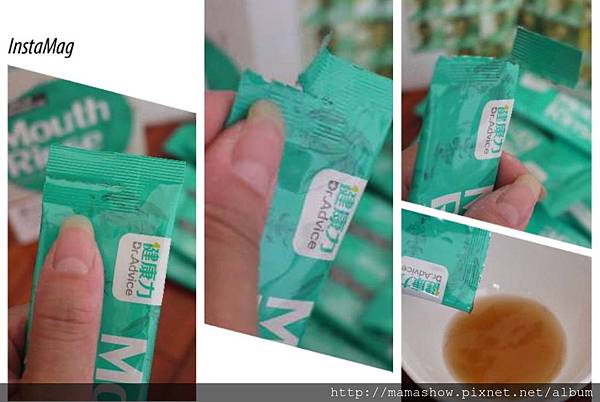 第二步:撕開後我們將漱立舒倒出~是茶葉的顏色,薄荷香氣~漱了30秒~也真的是非常清爽~