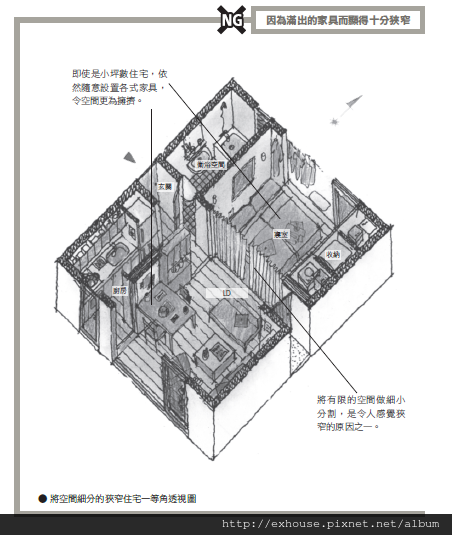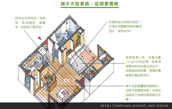 在狹窄住宅中如何不令人感到擁擠,就必須下工夫重點。「這裡是吃飯的場所、這裡是睡覺的場所」等,建議不要這樣細分空間用途。一旦將空間劃分開來,反而只會顯得更加偏狹。盡量以一個大房間為主,搭配上多樣化的使用方式。希望放上矮桌和坐墊,就可以當作茶室之用,若改上床墊與棉被,就轉化為寢室。只要把小家具放入壁櫥之中,一瞬間就能收拾好,讓空間顯得開闊舒適。