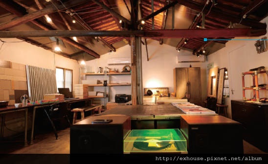 從大橋頭捷運站出來,穿越過騎樓,往昌吉街的方向走,老公寓沿路指引著,入口處的GOGORO充電站,宛如新時代的表率,轉進小院,巨大的洋傘在愜意的木桌上托腮,圍籬上充滿年輕活力的藝術塗鴉創作歡迎著來客,頂著人字型屋頂的老屋,以清爽的門面對我們招手;入內後的老屋樣貌,看起來有點熟悉,卻又好像被賦予新的生命。兩年前,我和這間新型態設計事務所的老闆SAM,坐在這還充斥著霉味的老房子裡,想像將來可以在這裡作些什麼有趣的事,現在它的樣貌是我們從來沒想像過的美妙,我想,這都要歸功於裡頭的那台黑膠唱片機。