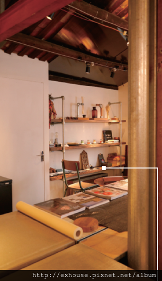 老屋並沒有換上了花俏的新妝,而是以最真實的樣貌示人,屋內的木橫樑結構都忠於原味地保留下來,牆壁全為白色,粉刷出一抹清新,開放式的書架是用代理的特色五金DIY建造的。一入門的主要空間採完全開放,居中的長桌和靠牆沿的長桌,有了彈性使用的可能,小門通往同樣無隔間的廚房區與材質實驗室,最近剛有烘豆職人進駐,每天早上都有咖啡香氣作陪,未來週末還會在庭院裡舉辦有趣的市集!