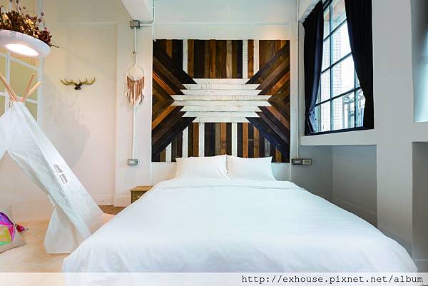 **多數的旅宿在床頭板上不會太拘泥,不外乎是木板、甘蔗板、床頭繃板,但有窩卻是和木工協力分割出一些幾何圖形,排列出了一張極具風味的壁畫床頭板。讓人印象深刻。