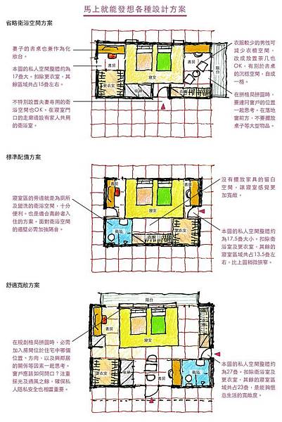 這個私人空間的配置規劃,如同前文第12頁所介紹過的,也能夠以格局拼圖的方式來進行。若想並列兩張單人床,寢室至少需要六跌坐佑的空間,至於廁所及盥洗等衛浴空間則約佔2疊左右,其他部分就適當地填補上衣櫥或書房等區域。