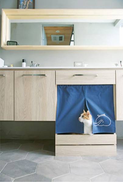 製的小型布簾讓規劃在洗手檯下方的貓砂盆,搖