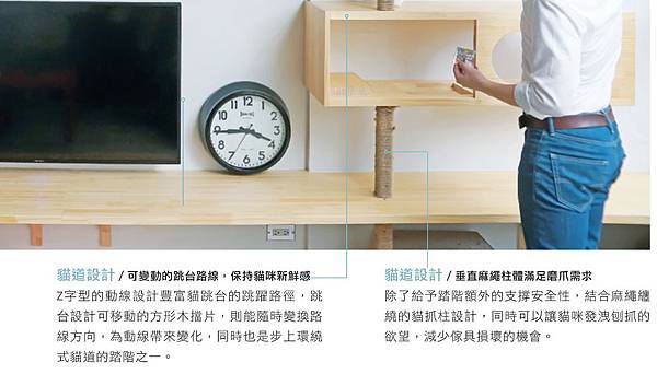 像是客廳電視主牆上方的貓山洞,讓貓咪在享受穿越山洞的刺激之餘,