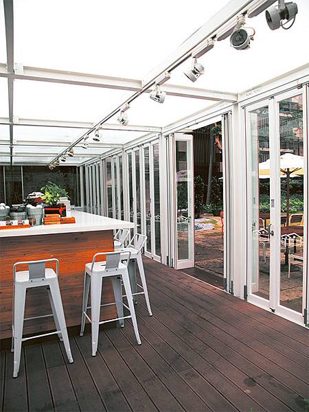 藍等色調。再搭配上大自然原有的顏色(如金屬,玻璃,木,竹等)呈現空間有如戶外的